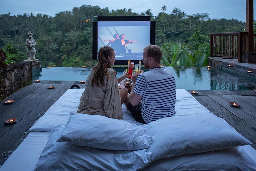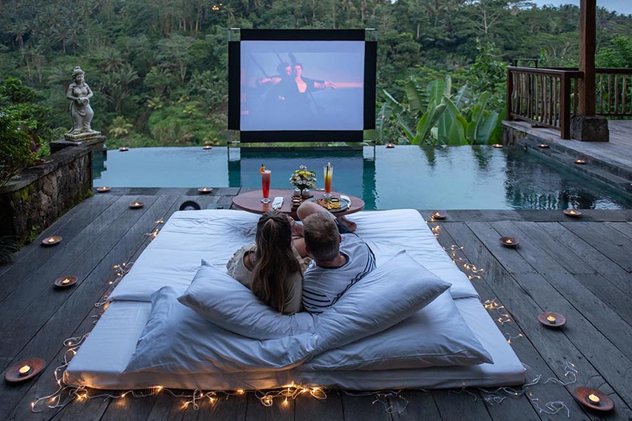 Experience the epitome of luxury and romance with our exclusive in-villa “Movie Under the Stars” at The Kayon Jungle Resort. Picture yourself nestled in the comfort of your private villa, surrounded by the enchanting sights and sounds of the jungle, as the night sky comes alive with twinkling stars.