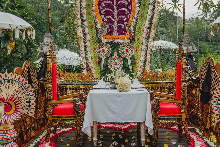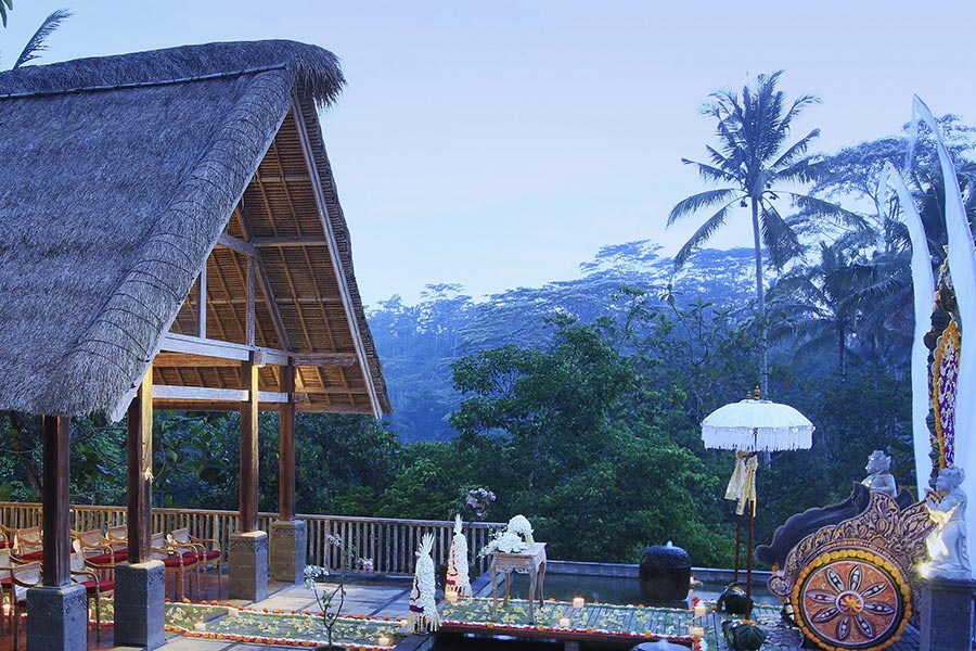 A floating Puspaka Chapel at the Kayon resort is set incorporate with Yoga pavilion has a truly Ubud magnificent natural setting of rice field, Jungles and river sounds. Designed with the antique Balinese royal carriage and decorated with local flowers will take you to the spirit of Shinta Love devotion.