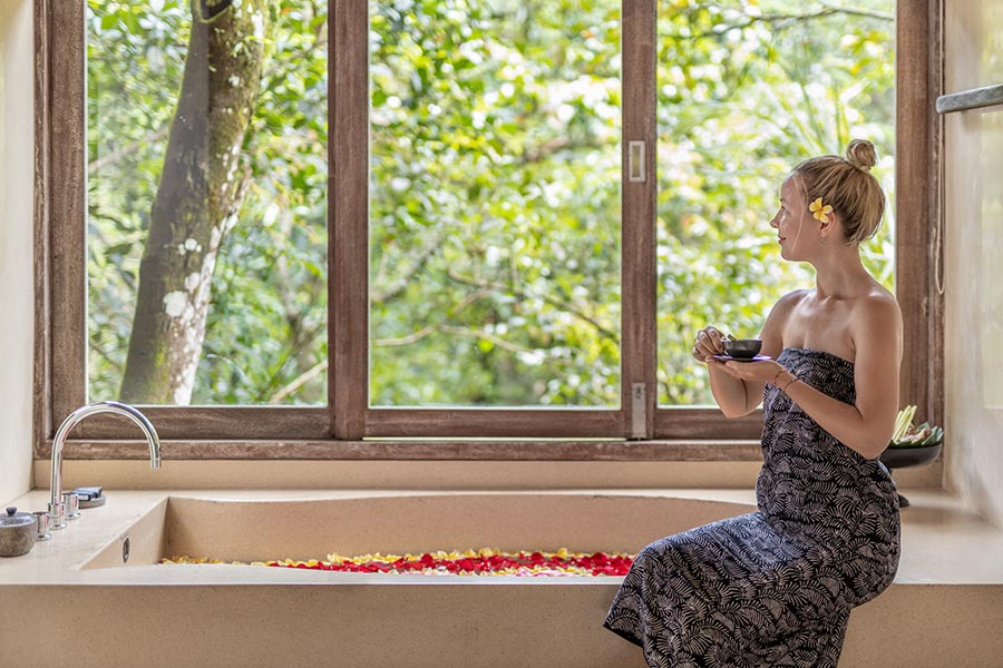 This stunning infinity pool lined with Batu Chandi stone, suspended in high over the surrounding river, appears to float in its setting. It’s a unique swimmer feeling for swimming above the treetops.