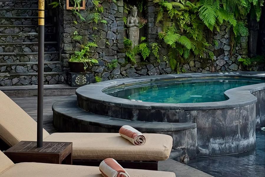 This stunning infinity pool is lined with Batu Chandi stone making it appear to float in its setting as if you are swimming above the treetops.